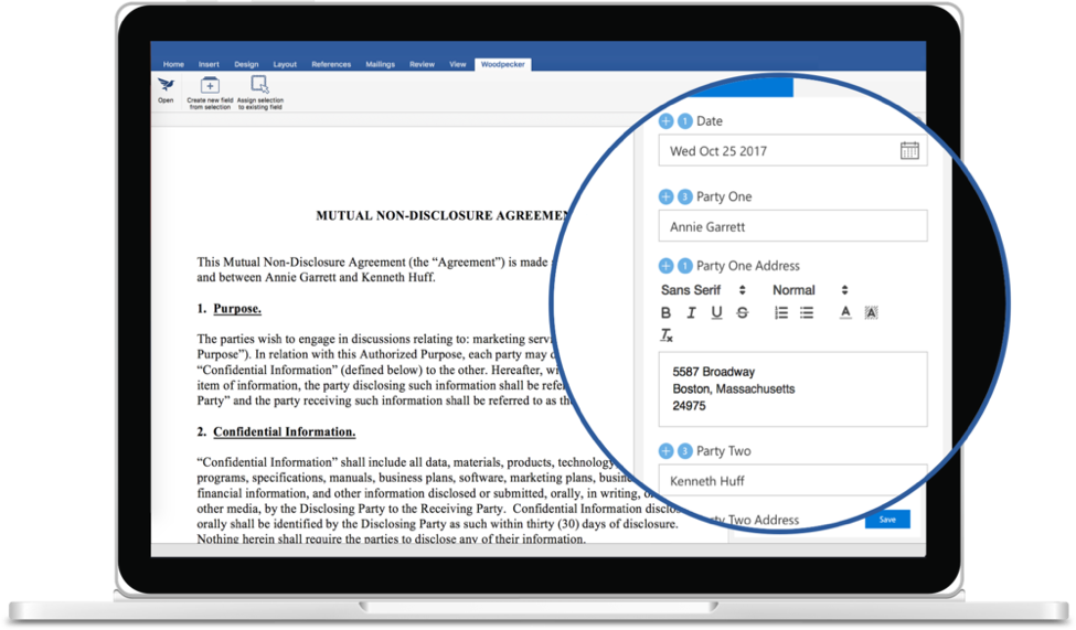 Woodpecker is an add-in for Microsoft Word that makes it easy to standardize frequently used documents (like contracts and pleadings) and automates the document preparation process. Using Woodpecker, you can quickly craft reusable legal documents that automate the tedious process of preparing documents for new recipients – saving you hours of time, and dramatically boosting your productivity.
